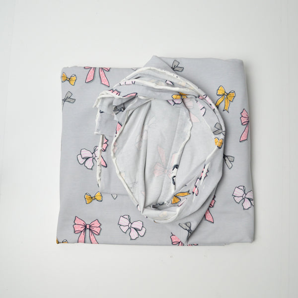 Gray, Pink + Yellow Bow Print Stretchy Knit Fabric - 64" x 70"