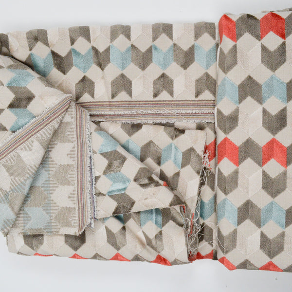 Brown, Blue + Red Chevron Tufted Chenille Woven Upholstery Fabric - 56" x 110"