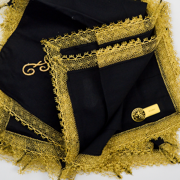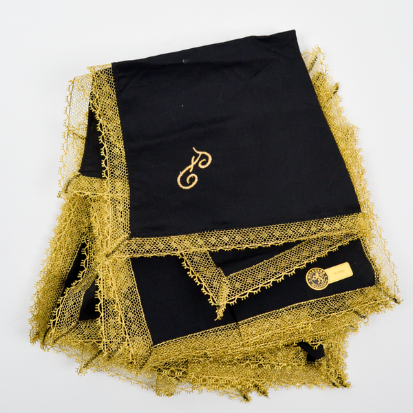 Only one of the napkins is monogrammed with a gold embroidered F. The others are identical but without the monogram. The cotton part of the napkin measures roughly 11.5", with the gold lace they're about 12.5" across.