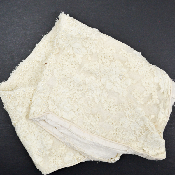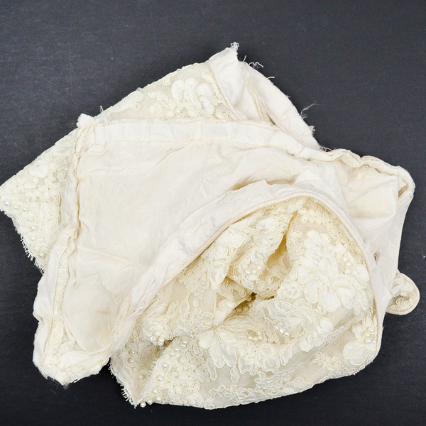 A roughly triangular piece of lace with bead + sequin details and a lightweight backing fabric. Looks like it could have been part of a wedding dress paneled skirt that was taken apart at the seams