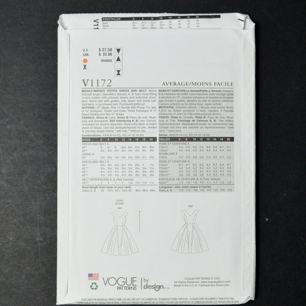 Vogue V1172 Misses'/Misses' Petite Dress and Belt Sewing Pattern - Size AA (6-12)