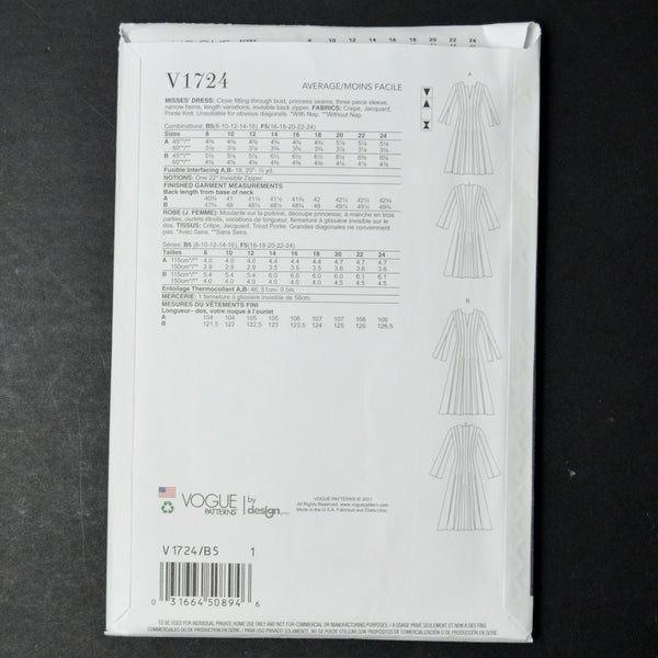 Vogue V1724 Misses' Dress Sewing Pattern - Size B5 (8-16)