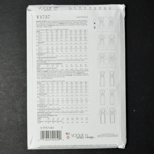 Vogue V1737 Misses' Dress Sewing Pattern - Size A5 (6-14)