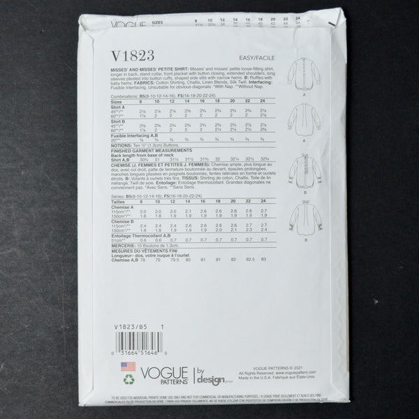 Vogue V1823 Misses' and Misses' Petite Shirt - Size B5 (8-16)
