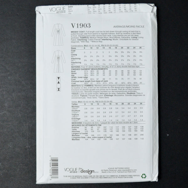 Vogue V1903 Misses' Coat Sewing Pattern - Size B5 (8-16)