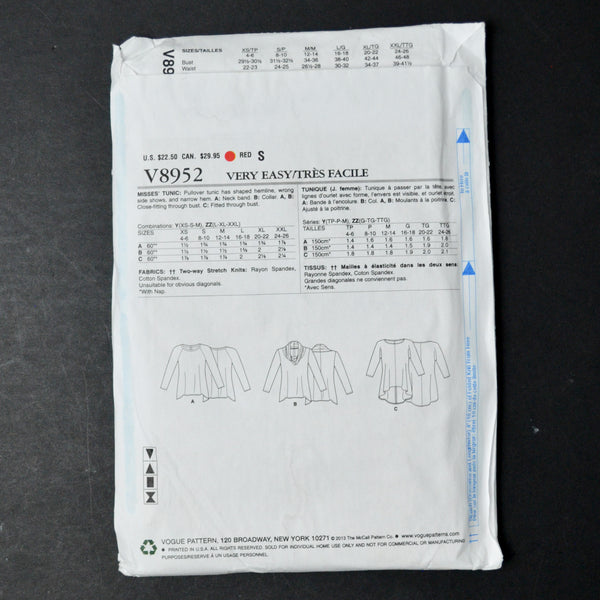 Vogue 8952 Misses' Tunic Sewing Pattern - Size Y (XS-M)