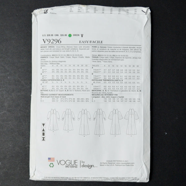 Vogue 9296 Misses' Dress Sewing Pattern - Size A5 (6-14)