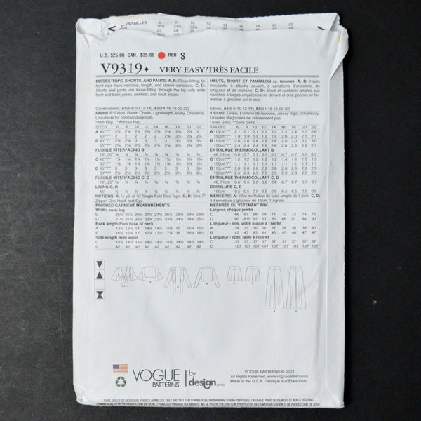 Vogue 9319 Misses' Tops, Shorts and Pants Sewing Pattern - Size A5 (6-14)