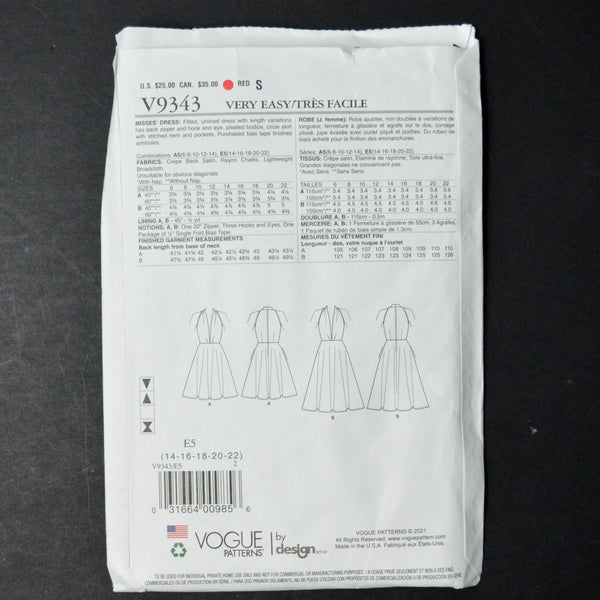 Vogue 9343 Misses' Dress Sewing Pattern - Size E5 (14-22)