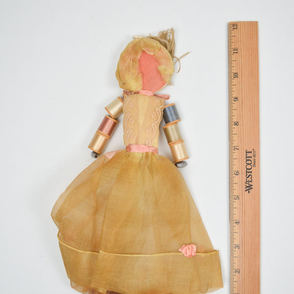 More spools of thread are stored in the hem of her dress, and her torso is a pincushion!