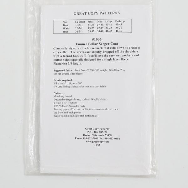 Great Copy Patterns 1005 Funnel Collar Serger Coat Sewing Pattern