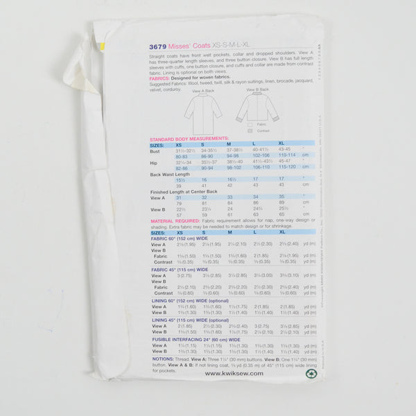 Kwik Sew 3679 Misses' Coats Sewing Pattern - Sizes XS-XL