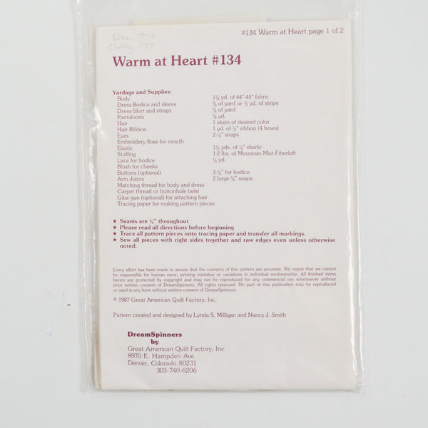 Dream Spinners #134 Warm at Heart Doll Sewing Pattern
