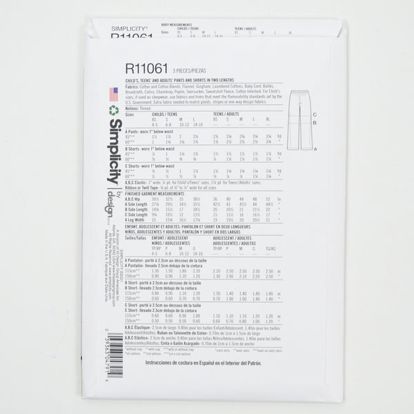 Simplicity R11061 Child's, Teen's and Adult's Pants and Shorts Sewing Pattern - Size A (XS-L, XS-XL)