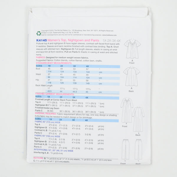Kwik Sew K4145 Women's Top, Nightgown and Pants Sewing Pattern - Size 1X-4X