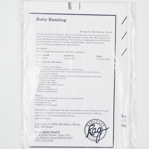 Rag Merchant Baby Bunting Sewing Pattern - Size XS-L