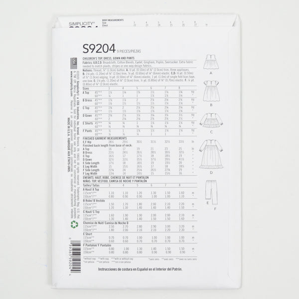 Simplicity S9204 Children's Top, Dress, Gown and Pants Sewing Pattern - Size 3-8