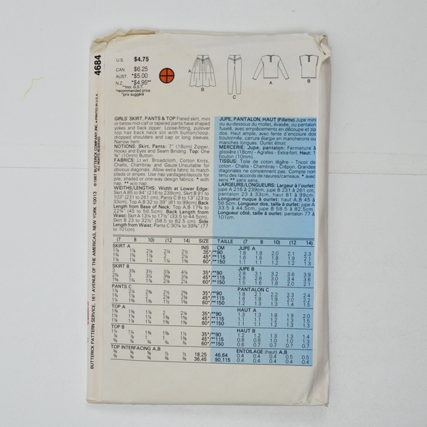 Butterick 4684 Girls' Skirt, Pants & Top Sewing Pattern - Size 12-14