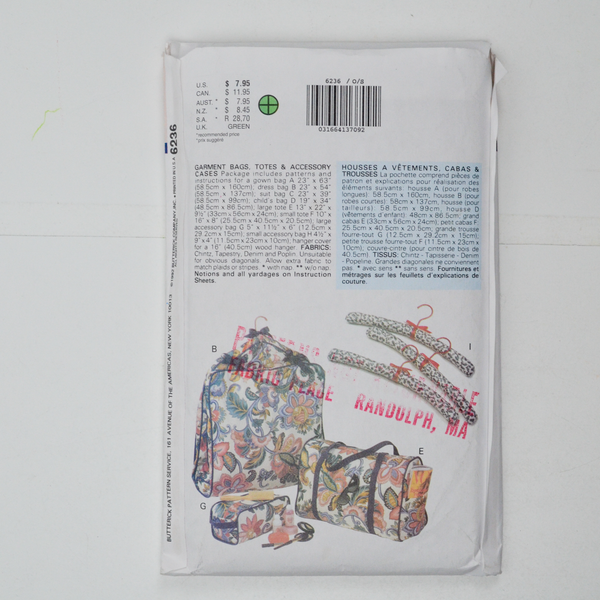 Butterick 6236 Garment Bags, Totes & Accessory Cases Sewing Pattern