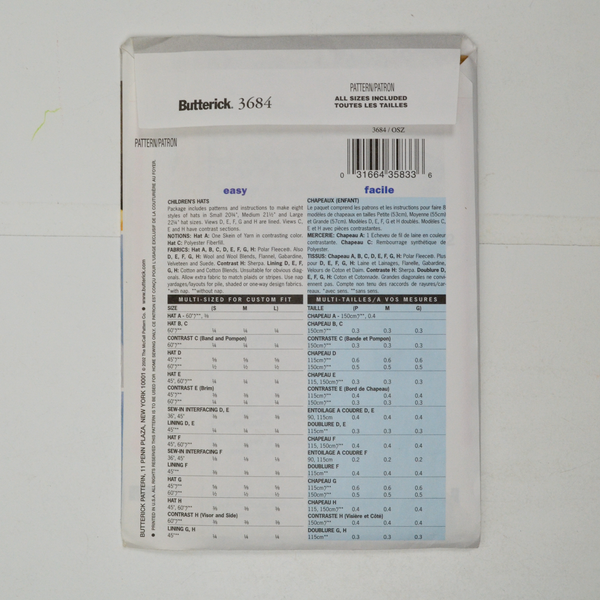 Butterick 3684 Children's Hats Sewing Pattern