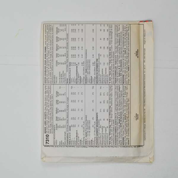 McCall's 7310 Misses' Lined Jackets Sewing Pattern - Size Y (XS-M)