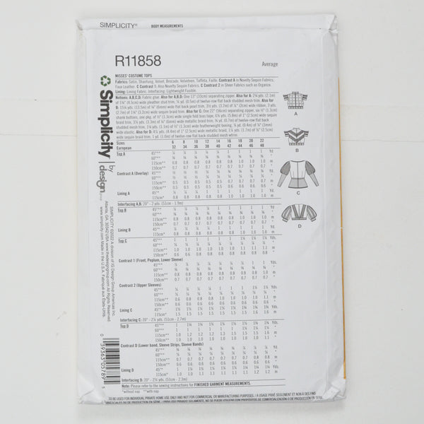 Simplicity R11858 Misses' Costume Tops Sewing Pattern - Size H5 (6-14)