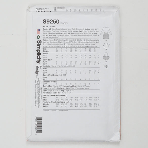Simplicity S9250 Misses' Costumes Sewing Pattern - Size H5 (6-14)
