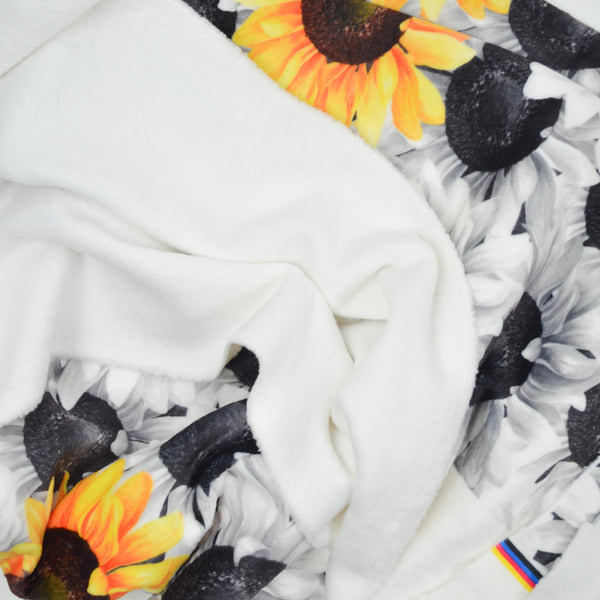 Grayscale + Yellow Sunflower Print Stretch Knit Apparel Fabric - 36" x 64"