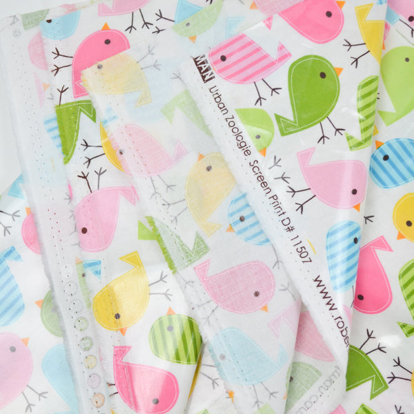 White, Green, Pink + Yellow Bird Print Robert Kaufman Cotton with PUL Waterproof Coating - 44" x 56"