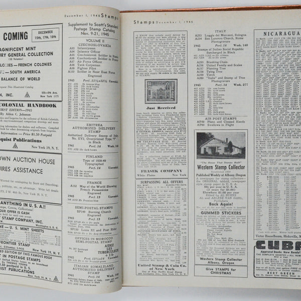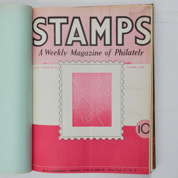 This is a bound book with a metallic copper cover that contains 13 issues of Stamps Magazine from 1945