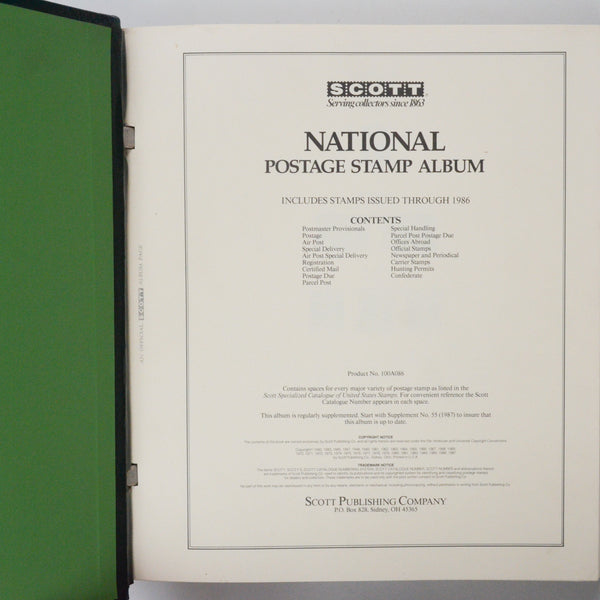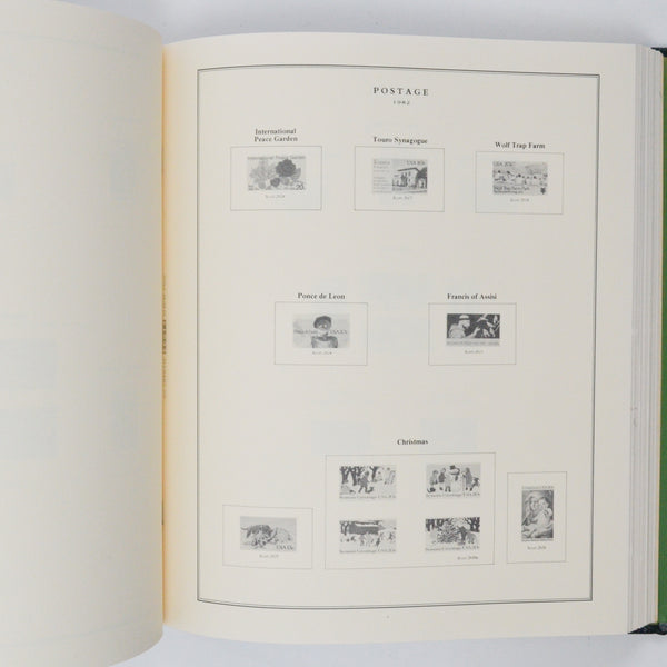Binder with printed stamps where you are intended to place your own! Title page indicates that it contains spaces for every major postage stamp as listed in the Scott Specialized Catalogue of United States Stamps, and includes stamps issued through 1986.